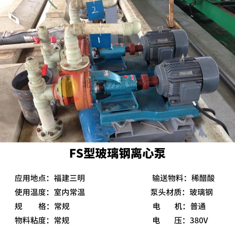 FS 型玻璃钢 离心泵 的主要用于石化、冶炼、染料、印染、农药、制药、稀土、皮革等行业,输送不含固体颗粒、不易结晶、温度不高于 100 ℃ 的各种非氧化性酸(盐酸、稀硫酸、甲酸、醋酸、丁酸)等腐蚀介质必不可少的理想设备。