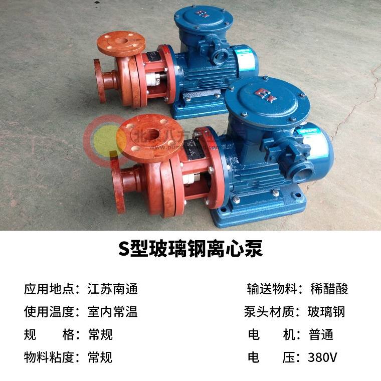 S 型玻璃钢 离心泵 主要用于石化、冶炼、染料、印染、农药、制药、稀土、皮革等行业,输送不含固体颗粒、不易结晶、温度不高于 100 ℃ 的各种非氧化性酸(盐酸、稀硫酸、甲酸、醋酸、丁酸)等腐蚀性介质。